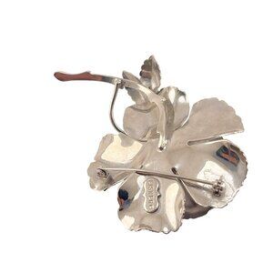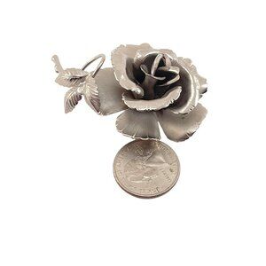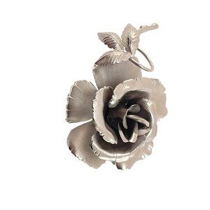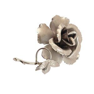 A vintage Lisner silver tone rose flower brooch pin. This elegant floral jewelry collectible measures 2 inches and a half, crafted from silver tone metal. It showcases a mid-century style.
