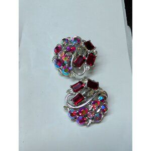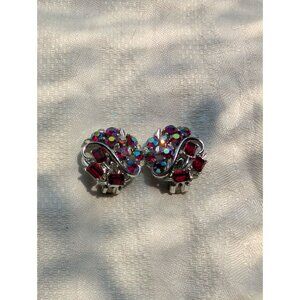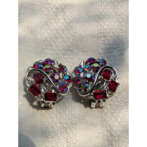 Vintage Lisner Silver-Tone Clip-On Earrings Red Iridescent Rhinestones