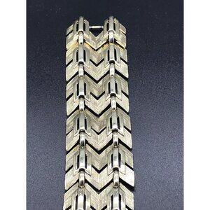 This exquisite vintage Lisner bracelet features a wide chevron link design with contrasting brushed and smooth gold tones, perfect for adding a touch of elegance to any outfit.