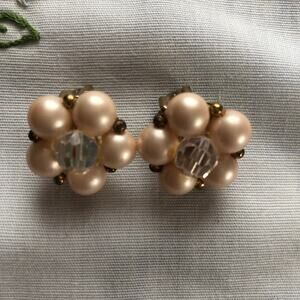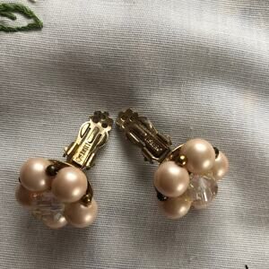 Vintage Lisner flower Clip Earrings Soft peach pearls Rhinestones