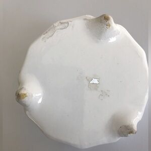 Small chip on one leg but does not affect the standing. See photos for other minor chip on bottom and some discoloration. This is vintage and sold as is.