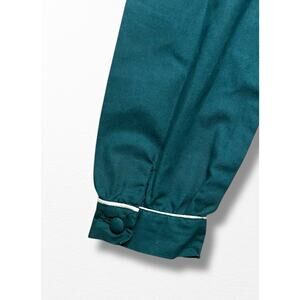 Hand-sewn smocked cotton holiday dress from boutique brand Little Lemurs in girl’s size 8. Gorgeous shade of forest green with tiny embroidered yellow flowers on the smocking. Features a Peter Pan collar with white piping, blouson sleeves with button cuffs and white piping, button-up back, and bow. Made in Madagascar with beautiful hand-made quality. Only flaw noted is a small mark on sleeve (pen?) as shown in last pic.