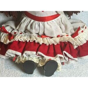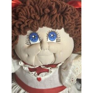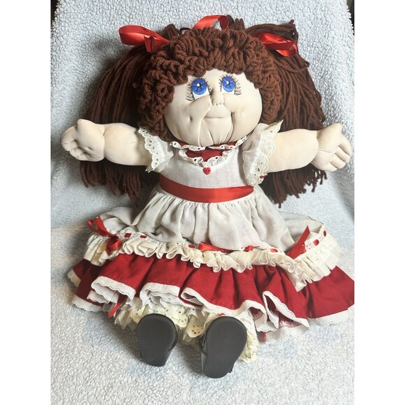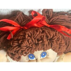 This Vintage Little People Soft Sculpture Doll is a handmade, 21-inch play doll with a soft cloth body and straight brown hair. She comes with a complete set including hair bows, outfit, undergarment, shoes, socks, and doll. This original doll from the 1980s has a light complexion, and blue eyes. Made in the United States, this girl doll is perfect for collectors or those looking to add a unique piece to their doll collection.