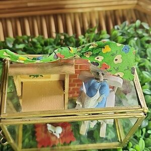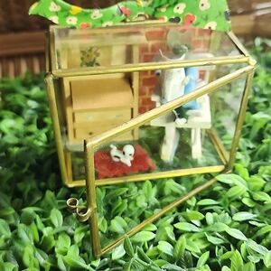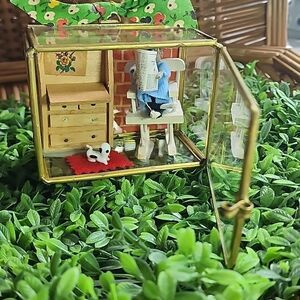 Absolutely adorable miniature Vintage brass & glass box diorama features Miss Mouse in a blue dress, reading the newspaper while her little mini glass pet sits on a red rug.