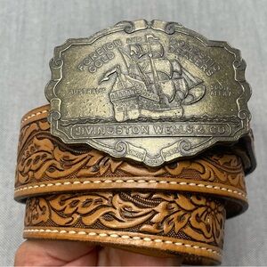 Vintage Livingston Wells&Co Nautical Gold Dealers w/Tooled Leather Hibiscus Belt