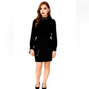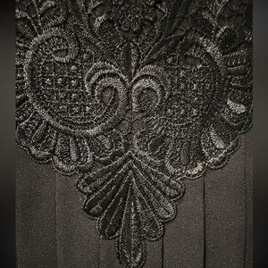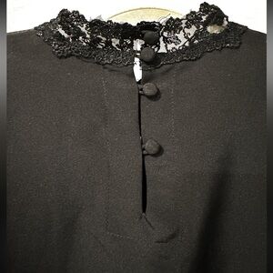 Chic black blouse with intricate lace collar. Perfect for elegant occasions. Classic and stylish design.