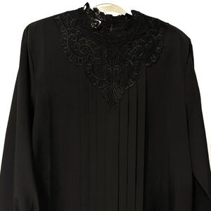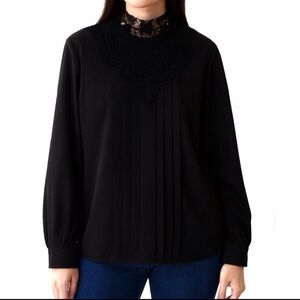 Timeless black blouse featuring a romantic high lace neckline, vertical pintuck pleats, and elegant floral embroidery.