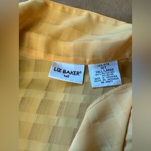 This vintage Liz Baker blouse features a yellow checkered pattern with a button-down closure. The sheer fabric adds a touch of elegance to the blouse, making it suitable for various occasions such as travel, party/cocktail, casual, and business meetings. The blouse is designed for women's size 10 tall and is made of high-quality fabric from Indonesia.