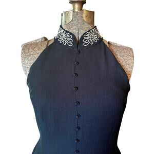 Vintage Liz Claiborne Black Halter Maxi Dress 8 Button Front Embroidered Collar