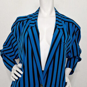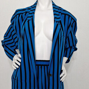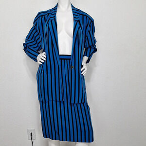 Vintage Liz Claiborne Blue Black Striped Single Button Jacket & Skirt Set Size 8