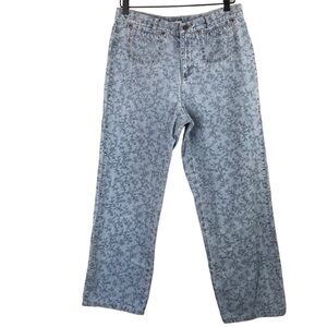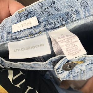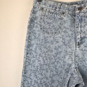 Vintage jeans from Liz Claiborne. 100% cotton. Light wash denim with black floral printed design. High rise. Straight leg. Rise 13 inches. Waist 16 inches flat. Inseam 25 inches