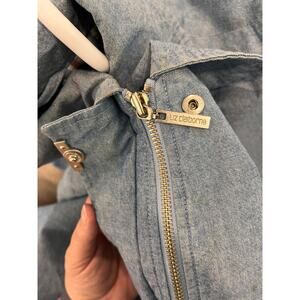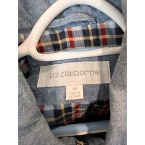 Step into classic 90s fashion with this vintage Liz Claiborne chambray jacket, size Medium. Features include a zip-front with snap plackets, plaid polyester lining, roomy flap pockets, and a detachable hood (included). One silver snap cover is missing, but the button functions properly. Perfect for layering on transitional weather days. Shell: 100% cotton, lining: nylon/polyester blend.