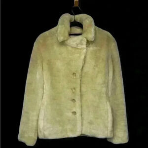 Elegant faux fur coat with button closure. Soft and stylish for any occasion. Excellent used condition. No stains. Soft. The color is cream and is somewhat lighter than how it appears in photographs.