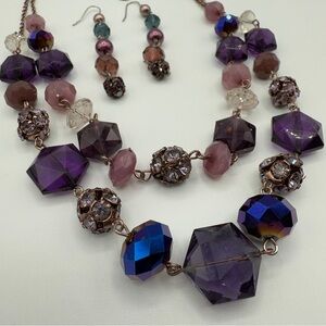 This stunning jewelry set features a beautiful combination of lucite purple beads in a variety of sizes and shapes. Comes with dangly beaded earrings.