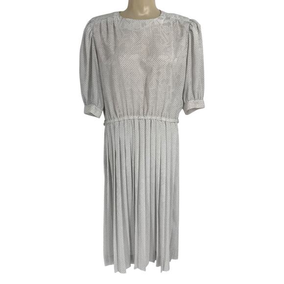 The Vintage Liz Claiborne Floral/Dots Button Pleated Tea Dress is a classic piece. Made from chiffon material, this dress features a black and white floral/dot pattern, button back detailing, and a pleated design, add your own belt or ribbon for a polished waist look. Perfect for various occasions. The brand, Liz Claiborne, is known for its quality and timeless designs, making this dress a versatile and stylish addition to any wardrobe. Please see all photos and measurements.