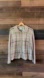 Vintage Lizsport zip-up sweater in a soft taupe knit with a bold windowpane check pattern in cream and brown tones. Features ribbed sleeves, hem, and a ribbed mock neck collar that gives a cozy fit. A versatile layering piece — style with jeans and boots for an easy everyday look, pair with wide-leg trousers for a polished casual outfit, or layer over a turtleneck for colder days.