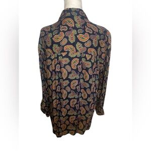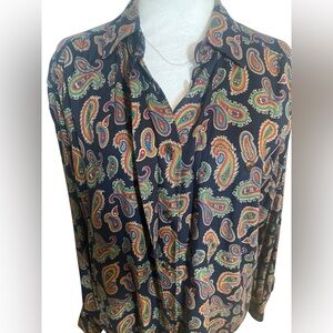 This vintage Liz Claiborne Lizsport women’s button down shirt is a timeless wardrobe piece with a bold paisley print in vibrant colors against a rich navy blue background. Designed with a classic collared neckline, long sleeves with button cuffs, and a relaxed fit, this blouse is perfect for both casual and dressy outfits.