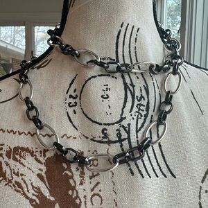 This is a vintage Liz Claiborne necklace featuring a bold and modern mixed-material chain design. It includes alternating oversized silver-tone and gun Metal gray links arranged in a doubled-up, layered style.