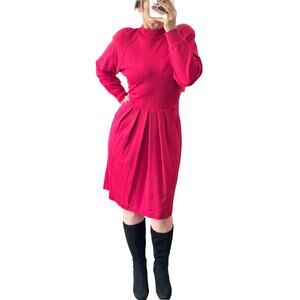 A beautiful blushing pink 80’s vintage wool blend dress with a pleated front, shoulder pads, mock turtleneck, and pockets! Preserved well and in pristine condition