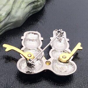 This vintage Liz Claiborne snowman couple pin brooch adds a touch of nostalgic charm to any collection. Crafted with gold and silver tones, it reflects the brand's elegance and whimsy. Ideal for enhancing winter attire with a sophisticated festive spirit.