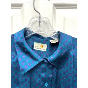Authentic 1980s Liz Claiborne silky blouse featuring a teal/purple abstract print, button front, blouson waist, long sleeves, and classic 80s tailoring.