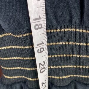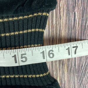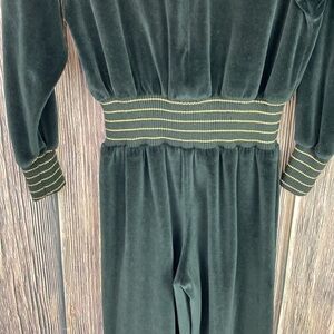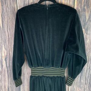 This is awesome!!! Vintage Liz Claiborne Black and gold jumpsuit. It feels like velvet plush material. The back zipper works great. The waist has a thick light elastic band (not stiff).