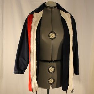 Vintage heavy cotton navy, red, and white jacket by Liz Claiborne. Zipper front with outer metal hook and snap closure system. A nice vintage piece in great condition.
