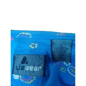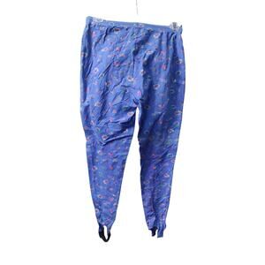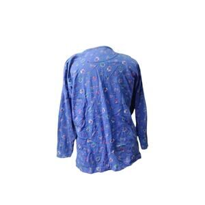Pants has an elastic band around waist with a pull tie inside. The shirt is a button up shirt and has padded shoulders. Blue with floral design.