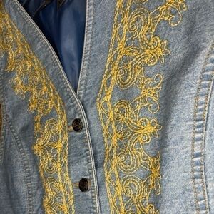 Obsessed with this Vintage Lizwear denim vest — total western meets boho dream piece! Features gorgeous bold yellow embroidery, a flattering structured fit, and button front. So easy to style for festivals, rodeo season, concerts, or layering year-round!