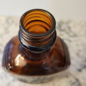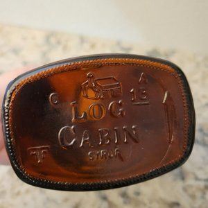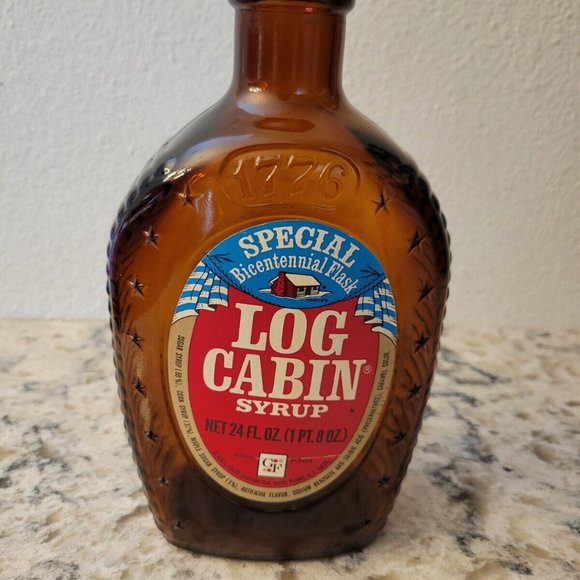 Vintage Log Cabin Syrup Amber Glass Bottle Special Bicentennial Flask with Flag/Drum/Fife. 24 oz (1 pint, 8 oz). Excellent condition with no cracks or chips. Original label. No cap.