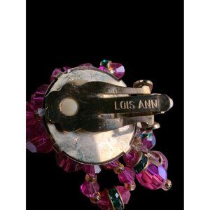 Gorgeous vintage Lois Ann designer clip-on earrings featuring cascading strands of pink aurora borealis crystals accented with emerald tone spacers. These 1980s statement earrings shimmer with Swarovski-quality sparkle, crafted in an intricate chandelier design. Signed "Lois Ann" on the clip backs, they are in excellent condition.