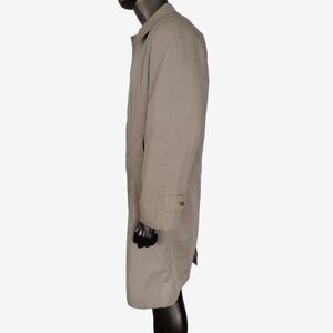 Vintage khaki colored coat, featuring a collared neckline, and long sleeves. Classic trench design, with a hidden front button closure, and a long, back vent. It has a removable faux fur liner with satin lined arms. There are 2 large side pockets and 2 large inner pockets. Extra buttons attached on the inside. Made from high quality materials. Feels super durable and has a good weight to it. The shell is machine washable. Made in the USA.
