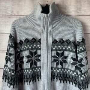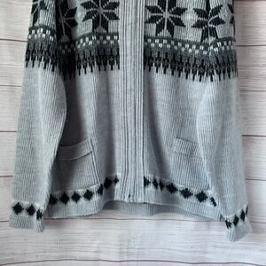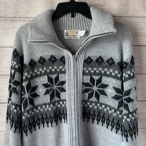 Vintage men's gray fair isle cardigan sweater by London Fog and made in the USA. This cardigan has long sleeves, a zip-up front closure, pockets on the bottom front, and a neckline that can be worn up like a turtleneck or folded down as a collar. It has a light gray base with darker shades of gray and black in the pattern that includes snowflake and diamond shapes. It is pre-owned, with light pilling or fuzziness, but is otherwise in good condition.
