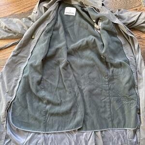Vintage London Fog women’s trench coat, size 8 Petite. Soft gray/green suede-feel fabric with zip-out fleece liner and satin trim. Features double-breasted front, shoulder pads, epaulets, and adjustable waist belt. Made in the USA quality with a classic timeless silhouette.