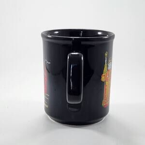 Bring a touch of London charm to your collection with this vintage black ceramic souvenir mug featuring iconic English landmarks and symbols. The bold design showcases a red double-decker bus, Big Ben, Tower Bridge, and traditional guardsmen in striking red and gold accents. A timeless collectible for Anglophiles, world travelers, and lovers of vintage kitchenware.