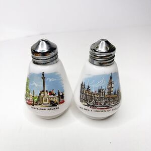 Vintage London Souvenir Milk Glass Salt Pepper Shakers Big Ben Trafalgar Square