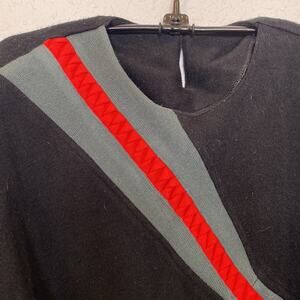 Vintage 1980’s long (almost maxi) black long sleeve (slightly shorter) knitted dress. Diagonal gray stripe with red faux knit zipper. Unique design! Keyhole back with button closure. Pullover dress. Shoulder pads. Thick knit. Not lined. Relaxed fit. Round neck.