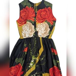 Vintage Long Black Satin Sleeveless Dress With Red And Gold Floral Pattern, 60s