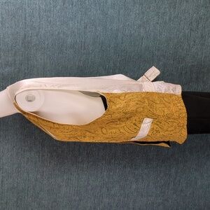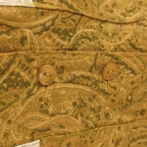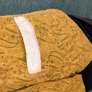 The front feels like a stiff cotton, ALMOST like a thin denim... it is mustard yellow with paisley design. The back is pale yellow satin, and this also lines the tops of the pockets. The satin trim on the pockets has light staining, not bad.
