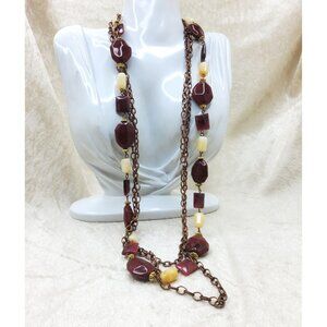 A statement piece that adds bold elegance to any outfit. Featuring chunky geometric beads in rich brown and yellow hues, this long necklace offers a unique blend of vintage charm and modern style. Its double chain design makes it a versatile accessory for layering or wearing alone. copper chain