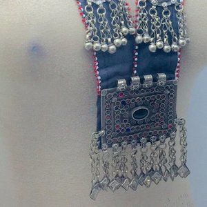 This exquisite piece is handcrafted by Kuchi artisans. With the fabric of this necklace, there are vintage coin pendants with dangling tassels on each side.