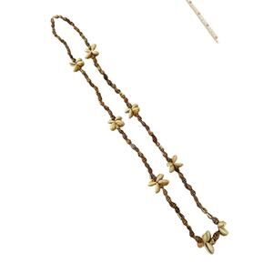 Long colorful conch and cowrie shell necklace. the conch shells are small and in great shades of brown and tan. They're interspersed with little "flowers" made of four white and yellow cowrie shells. There are 8 cowrie shell flowers on this strand. Measures 32" and has no metal, so perfect for someone with metal allergies and great unisex necklace for a beachy vibe!