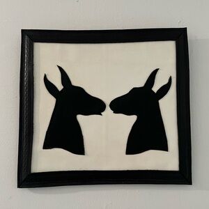 Features 2 donkey silhouettes. All leather stitched around a metal frame. Leather hook on back for hanging. Measures approx 12” x 13”.