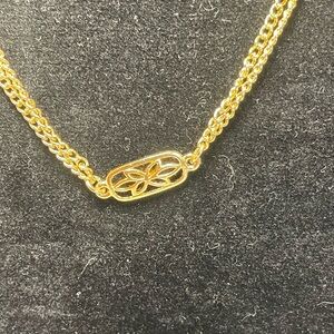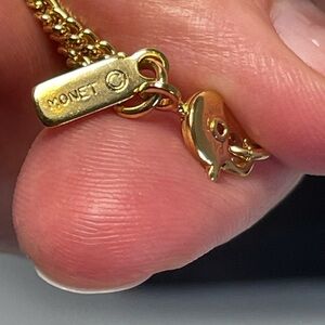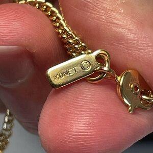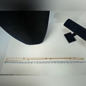Stylish vintage Monet gold tone layered necklace. It features a double strand chain with multiple, floral design connectors. 27-inch drop
