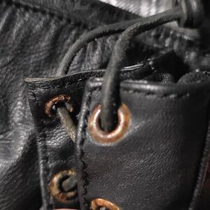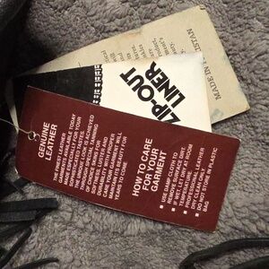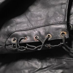 Vintage genuine leather riding jacket. Still unworn with tags. It does look to be an older storage rescue. Very nice red florals that really make it stand out! I would replace the side tie eyelets(age/stoage humidity?), but everything else looks to be in excellent condition. Who wants to bring her out for a cruise? See all pictures!