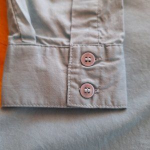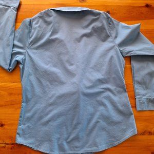 Classic but sexy sage material with matching buttons, princess seams in front to hug curves, shirttail hem, and a spare button. See other listing in my closet for other in same style/size in black color. Approx measurements: length 24.5", bust 20", waist 18", hip 19.5". Pet friendly home but kept in spare room closet. Wood background is dining table, not the floor.