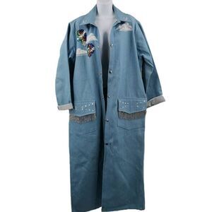 Vintage Long Denim Trench Coat with Hot Air Balloons & Beaded Fringe | Size M (Fits L-XL)