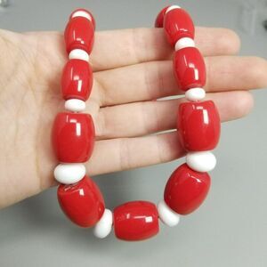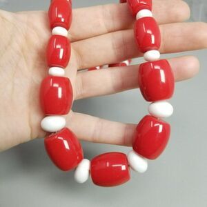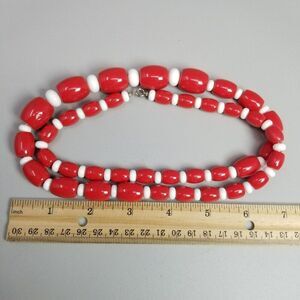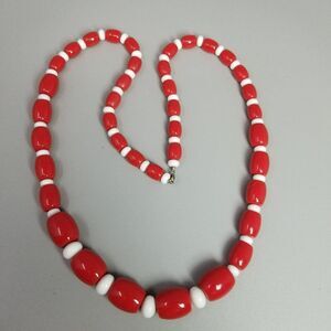 Vintage Long Red and White Beaded Necklace, Plastic Graduated Size, Statement