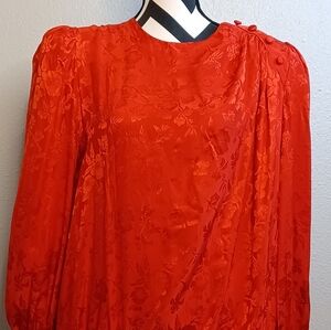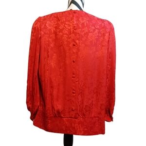 Vintage Long-Sleeve Floral Jacquard Pattern Loose Fit 100% Silk Secretary Blouse.