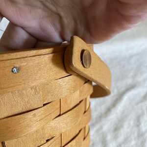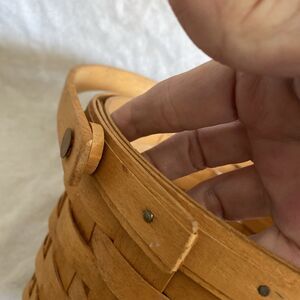This vintage Longaberger storage basket is a beautiful addition to any collection. Made in 1996, it features a round shape with a weave pattern in brown colors. Measuring 6.5 inches in height and 8 inches in width, it comes with a handle and is perfect for all occasions. The basket is ideal for storing apples or any other items you might need. Please see pics for condition